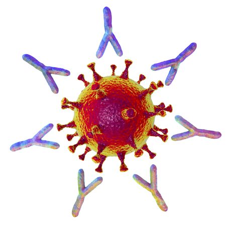 Medical concept illustration corona virus particles interacting with epitopes of antibodies immunoglobulins produced by immune system. 3d illustration.
