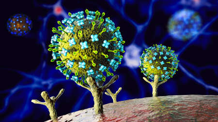 Nipah viruses binding receptors on human cells, an initial stage of Nipah infection. A newly emerging bat-borne virus that causes acute respiratory illness and severe encephalitis, 3D illustration