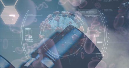 Digital illustration of scope scanning, macro Covid-19 cells floating over binoculars. Coronavirus Covid-19 pandemic concept digitally generated