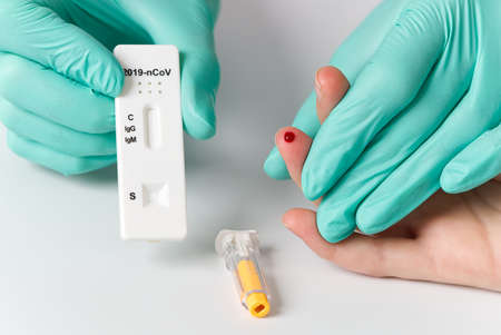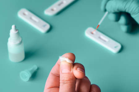 Express COVID-19 test for IgM and IgG antibodies to novel coronavirus SARS-CoV-2, Covid-19. Nurse hand in glove applies blood to the test with pipette. Patient fingers in front, green mint background.