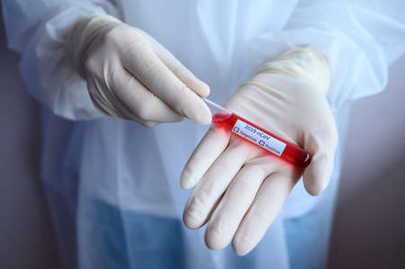 Close up of scientist doctor hand holding a sample test tube with blood for 2019-nCoV analyzing. Conceptual of laboratory testing for the respiratory coronavirus disease 2019 (COVID-19).