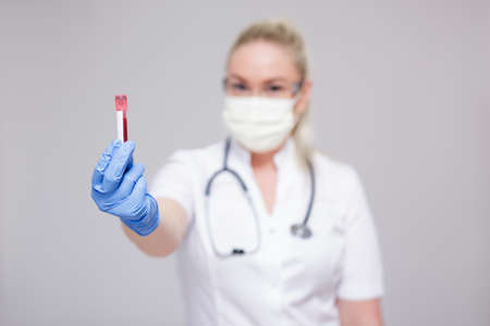 health care, medicine, microbiology and corona virus pandemic concept - doctor or nurse in white uniform and medical mask holding blood test tube over gray background