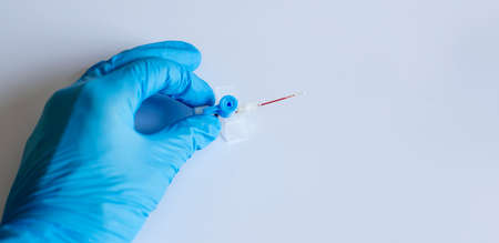 Hand with safety gloves holding a tube filled with blood for a test on a white background. Coronavirus concept.