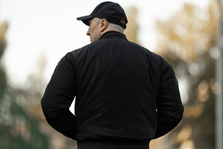 man wearing a black bomber jacket and sportswear stands in an outdoor setting. The environment features blurred trees in the background showing an active and healthy lifestyle.