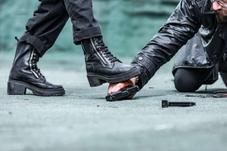 Female hand Holding Gun, close up. War Action Movie Style