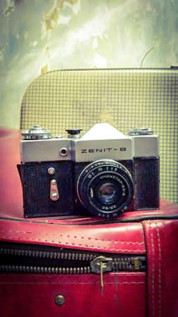 A still life of accessories from old film camera: camera, lens, film cassette, piece of film, film container.