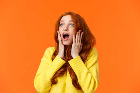 Oh no something falling from sky. Shocked and speechless, startled young concerned redhead woman drop jaw, gasping and staring upper left corner concerned, touching face worried, orange background