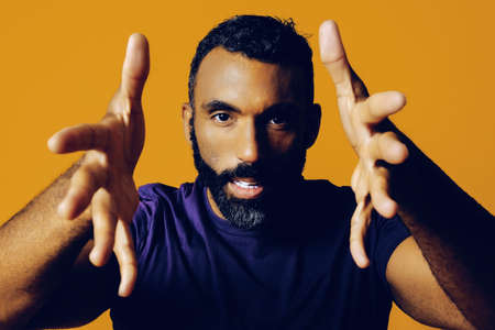 closeup portrait of a handsome young adult man with a beard and a mustache hands framing camera fingers pointing on a yellow background