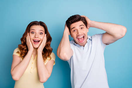 Omg. Shocked middle aged spouses touching face and cheeks, looking at camera isolated on yellow studio background