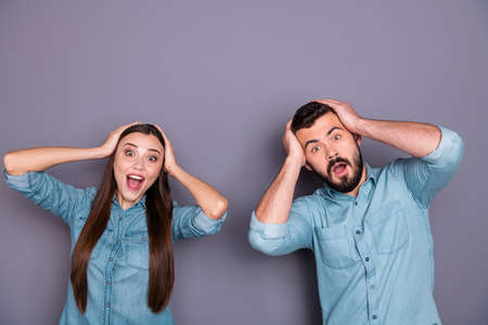 Portrait of two her she his he nice attractive charming lovely cheerful cheery amazed brown-haired person got great unexpected news isolated over gray violet purple background