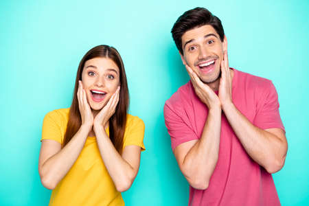 Portrait of his he her she nice attractive lovely delighted glad cheerful cheery couple impressing good news isolated over bright vivid shine vibrant green blue turquoise background