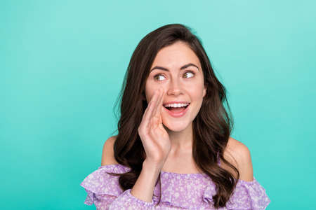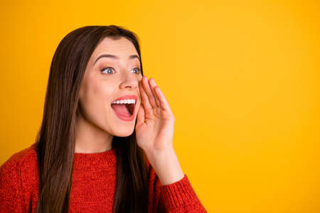 Photo of cute charming nice gorgeous youngster shouting at empty space to draw your attention to information notified isolated over vivid color background