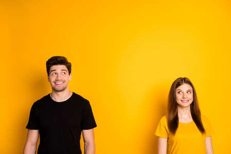 Photo of cheerful cute nice gorgeous couple looking up at empty space in search of new ideas for developing their relationships isolated over vibrant yellow color background