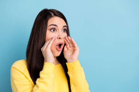 Profile photo of adviser speaker lady palms open mouth scream wear yellow jumper isolated blue background