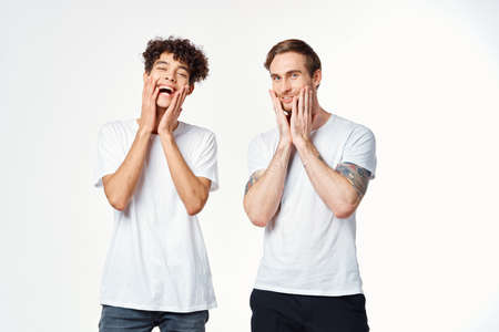 Cheerful friends angels t-shirts stand next to emotions isolated background