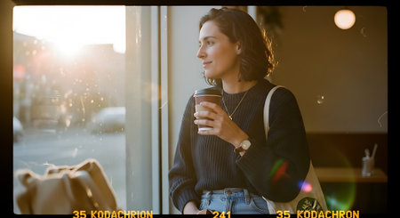 A young woman enjoys a cup of coffee while looking out the window