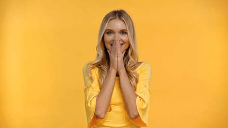 Happy woman covering mouth with hands isolated on yellow