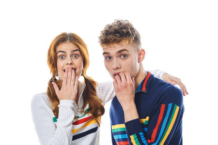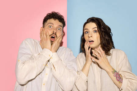 Half length portrait of young emotive man and girl looking at camera isolated on blue and pink trendy color background. Human emotions concept