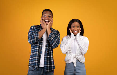Happy, funny and surprise are natural emotions. Amazed african american young man and woman with open mouths seeing something unusual and very glad, isolated on yellow background, studio shot