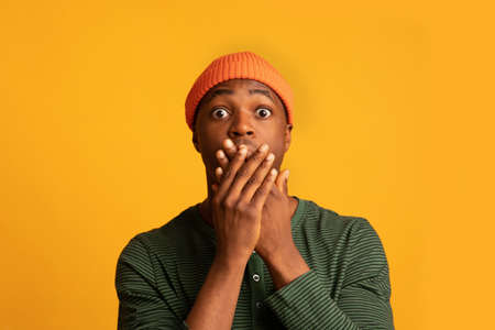 No Way. Terrified Black Hipster Guy Covering Mouth And Looking At Camera