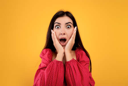 Unbelievable. Shocked armenian lady with open mouth and hands on cheeks posing over yellow background