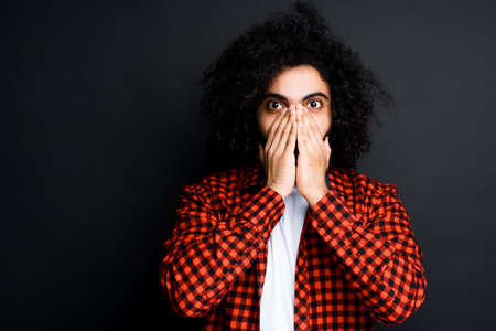 Handsome egyptian with afro hairstyle in fear closes his mouth with his palms
