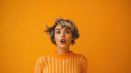 Young woman in orange sweater and striped t - shirt with yellow eyes.
