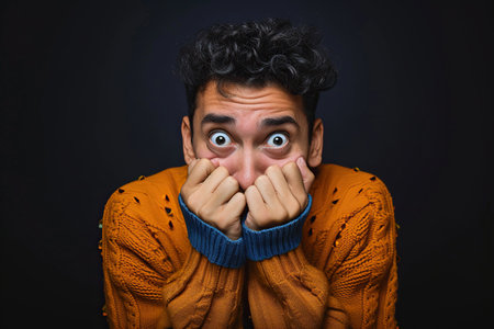 Nervous Latin man and biting nails in studio with oops reaction on black background.