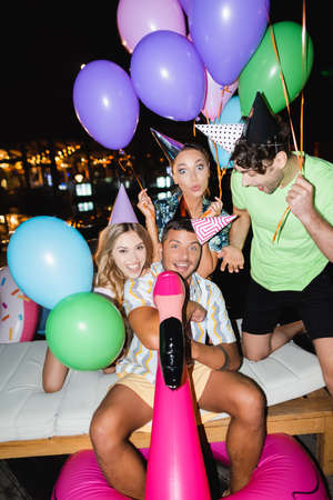 Selective focus of young man in party cap holding disposable cup near friends during party at night