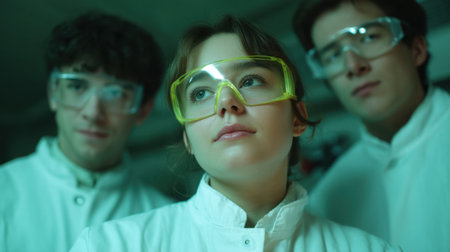This vibrant image showcases a group of young scientists wearing protective gear in a laboratory setting, emphasizing innovation, teamwork, and the spirit of scientific discovery.