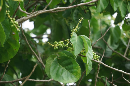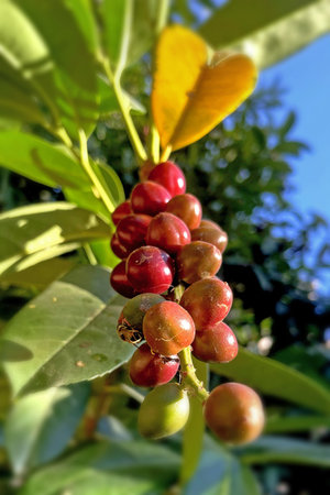 Selective focus on raw fruit and green leaves in the garden. Tropical plant. Group of fruit and green leaves on blurred bokeh background and sunlight. Beauty in nature.