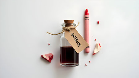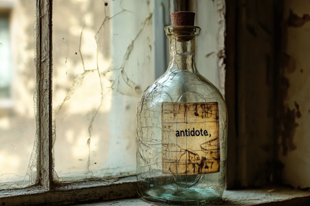A cracked glass bottle labeled 'antidote' rests on a sun-drenched windowsill, surrounded by an atmosphere of nostalgia. The soft light streaming in accentuates the bottle's texture and the delicate shadows cast on the weathered wood.