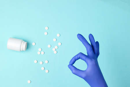 Hands in medical gloves show OK gesture on a blue background with pills. Top view