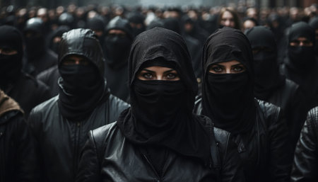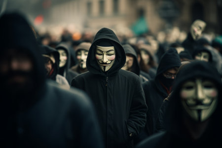 A group of young people dressed all in black goes out on the street to demonstrate with anonymous masks.
