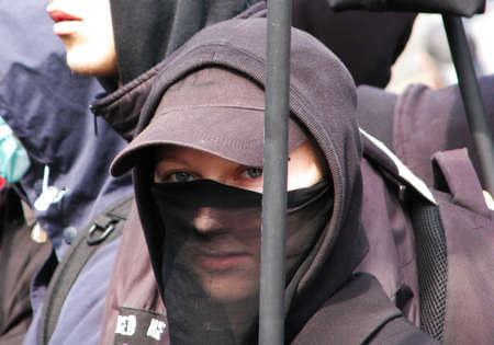Kiev, Ukraine April 12, 2009: A march of Kiev students “Down with capitalism†masked near the Kiev metro station “Arsenalnayaâ€,