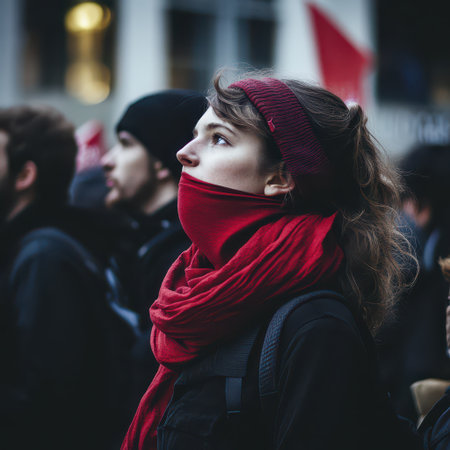 Young person wearing a bandana during a demonstration in an urban area on a sunny day