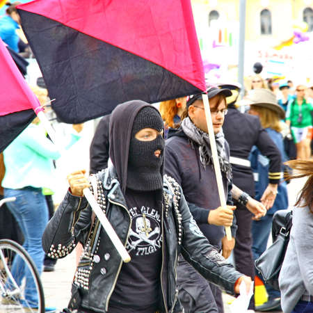 Helsinki, Finland - June 29, 2019: Antihomophobe activists in masks on Helsinki Pride festival on the street