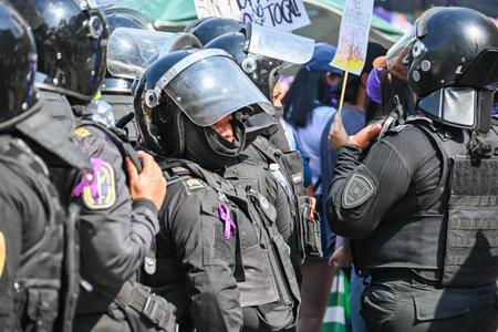 Protesters hold placards while law enforcement stands with riot shields, illustrating the tense confrontations during a justice rights march.