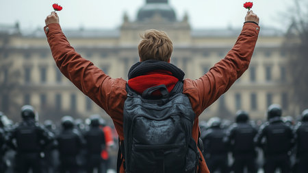 A young man with a backpack stands with raised hands in defiance before a line of police officers, symbolizing protest, resistance, and freedom of expression.