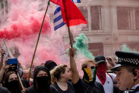 The antifa flag being displayed at an anti fascist demonstration in opposition to a rally by supporters of the former EDL leader Tommy Robinson