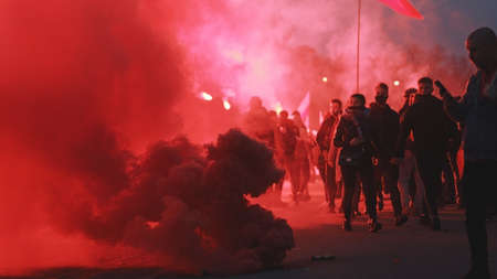 Warsaw Poland 11.11.2020 - Participants at the independence march burn red flares at the Dmowski roundabout in Warsaw . High quality photo