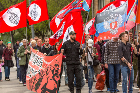 MOSCOW, RUSSIA - MAY 1, 2016: Unidentified National Bolsheviks, together with Communist party supporters take part in a rally marking the May Day in the center of Moscow.
