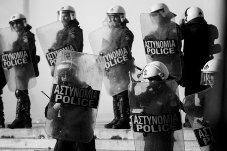 ATHENS, GREECE - APRIL 15, 2015: Riot police and protesters during a protest in front of Athens University, which is under occupation by protesters leftist and anarchist groups. Black-and-white reportage shooting.