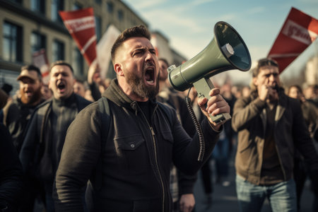 Group of people marching in a protest with red flags on a gloomy day. Generative AI