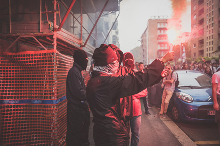 MILAN, ITALY - OCTOBER 18: manifestation held in Milan october 18, 2014. People took streets to protest against racism, war and against lega nord, right wing politic italian movement
