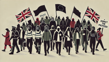 Crowds rally with placards demanding justice while law enforcement in riot gear stands ready, reflecting societal tensions and struggles for rights.