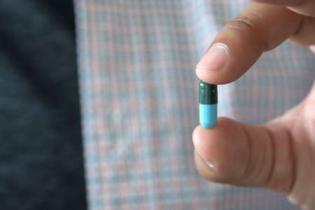 Young adult hand taking a daily dose of medicine for a chronic disease. Caucasian person with a painkiller addiction problem