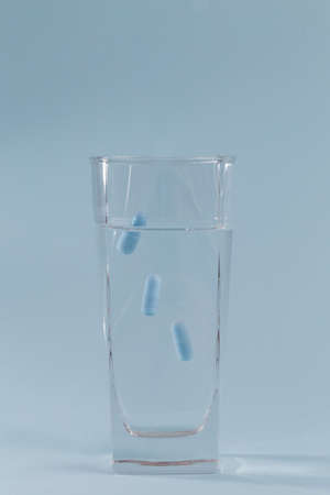Blue and white capsules on blue background. Copy space. Global healthcare concept. Antibiotics drug resistance. Antimicrobial capsule pills. Pharmaceutical industry.