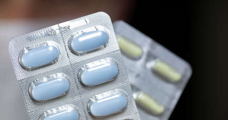 Medicine pills on a light background. Medicines and prescription pills flat lay background. Blue and pink medical tablets in blister.