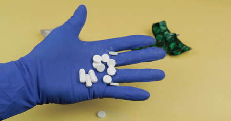 A large amount of white round and oval pills in hand dressed in rubber blue sterile medical glove. Concept of medicine and health improvement. Disease and the way of its treatment